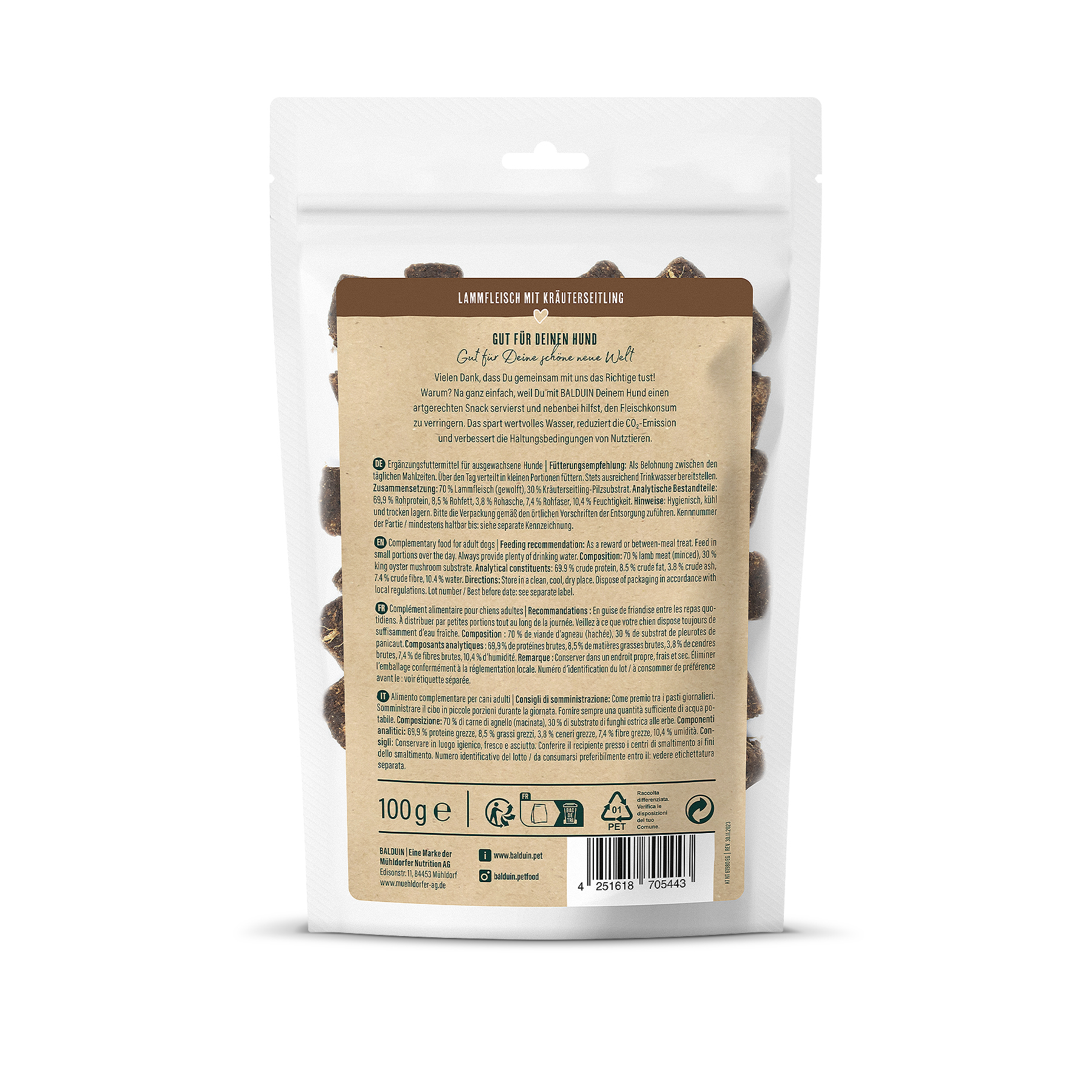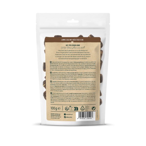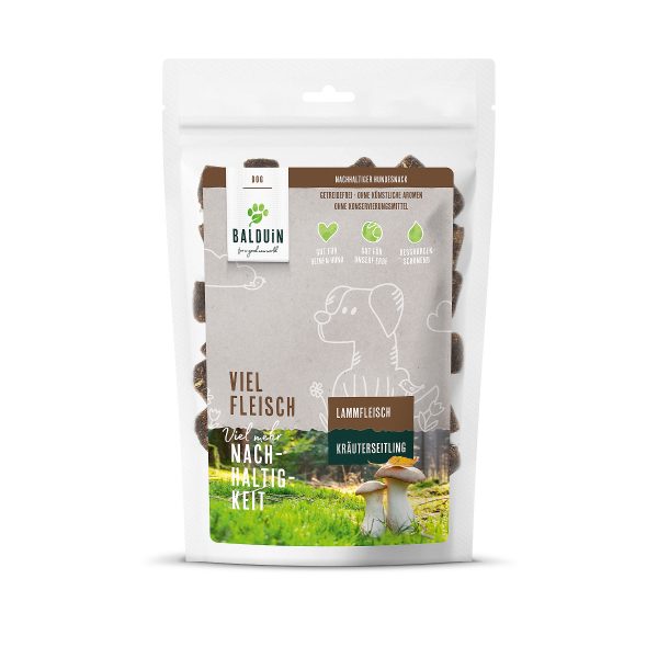 Die rein natürlichen Würfelchen bestehen aus 70 % Lammfleisch und 30 % wertvollem Kräuterseitling-Pilzsubstrat, das die Extraportion Nachhaltigkeit sorgt. Denn mit den Snacks von BALDUIN belohnst Du Deinen Hund nicht nur mit einem artgerechten Leckerli, sondern hilfst zugleich den Fleischkonsum zu verringern. Das spart wertvolles Wasser, reduziert die CO2-Emission und verbessert die Haltungsbedingungen von Nutztieren.