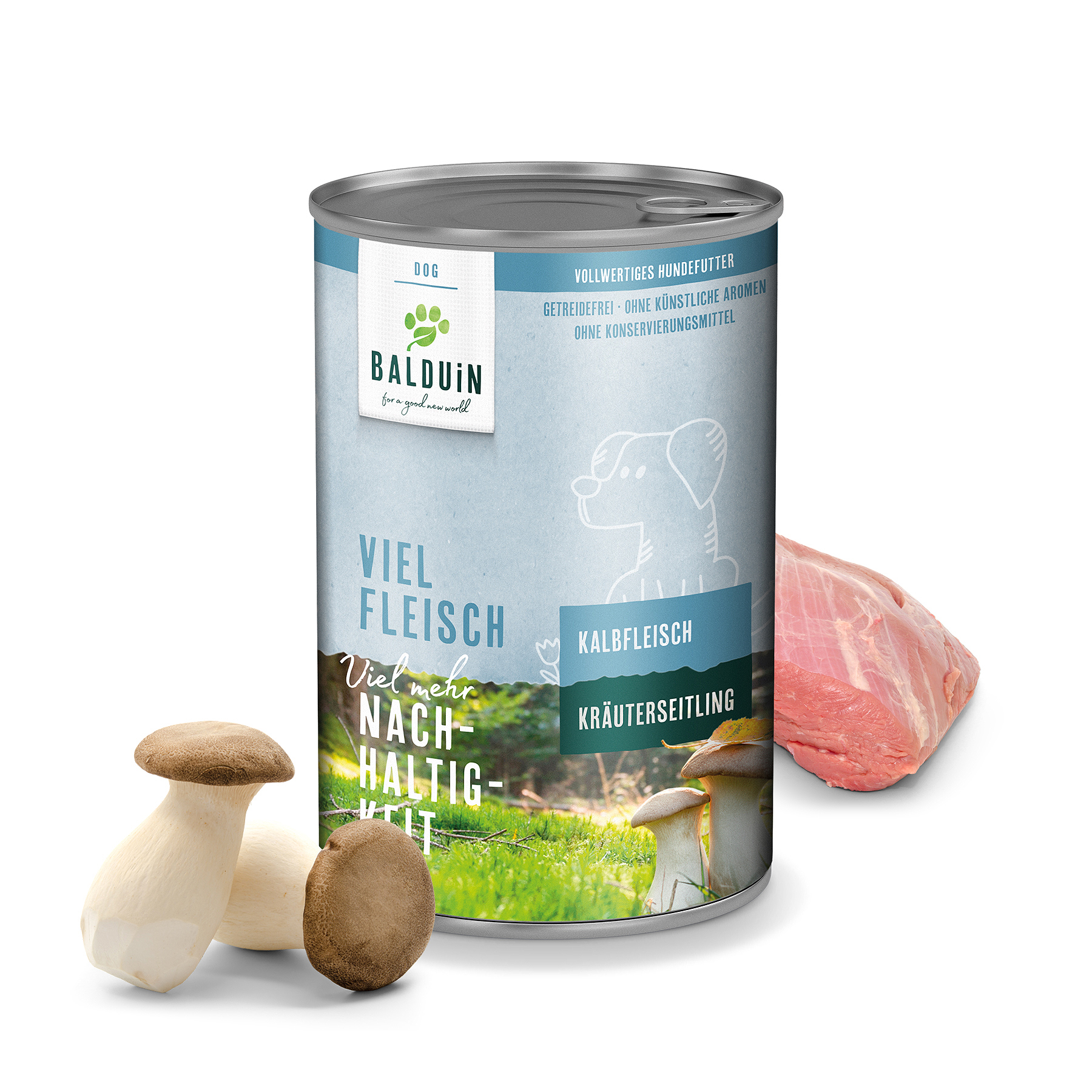 BALDUIN ‚Kalb mit Kräuterseitling‘ ist ein vollwertiges Hundenassfutter, mit dem Du eine artgerechte und umweltverträgliche Ernährung Deines vierbeinigen Begleiters in Einklang bringen kannst.